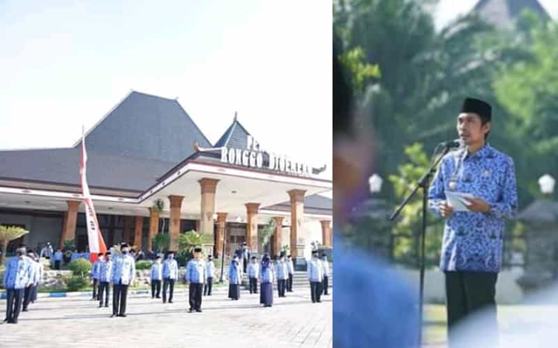 JATIMPOS.CO/KABUPATEN MADIUN - Pemerintah Kabupaten Madiun melaksanakan upacara peringatan Hari Pahlawan Nasional tahun 2020 di Halaman depan Pendopo Ronggo Djoemeno Caruban, Selasa (10/11/2020).