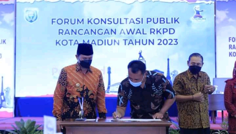 JATIMPOS.CO/KOTA MADIUN - Pemerintah Kota (Pemkot) Madiun melalui Badan Perencanaan dan Pembangunan Daerah (Bappeda) Kota Madiun menggelar Forum Konsultasi Publik Rancangan Awal RKPD Kota Madiun Tahun 2023 di Ballrom Bima Hotel Aston Kota Madiun, Kamis (10/2/2022).