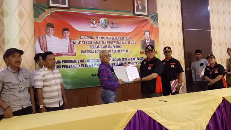 Penandatangani kontrak pembangunan fasilitas kesehatan dan perawatan lanjut usia berbasis wisata ekologi inidisaksikan kepala desa setempat dan tokoh masyarakat.