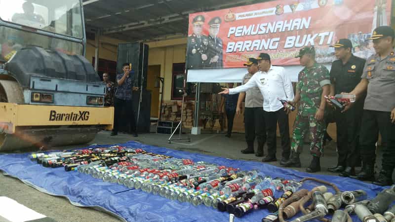 Disaksikan dan simbolis langsung oleh Kapolres Sampang, AKBP Didit Bambang Wibowo Saputro, Bupati Sampang H. Slamet Junaidi dan Mayor Inf Jupri Kasdim 0828 Sampang, pemusnahan Miras dan Knalpot brong di gelar.