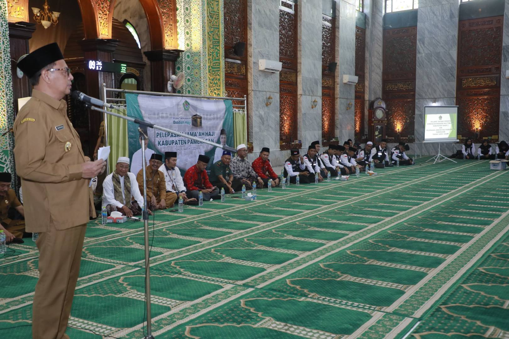 JATIMPOS.CO/PAMEKASAN - Penjabat (Pj) Bupati Pamekasan, Masrukin, melepas 1.300 calon jemaah haji (Calhaj) di Masjid Agung Asy-Syuhada, Senin (3/06/2024).