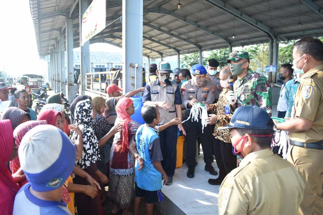JATIMPOS.CO/TUBAN – Gugus tugas percepatan penanganan Covid-19 Pemkab Tuban menyapa nelayan dan pedagang di Kecamatan Bancar. Kedatangannya membagikan ribuan masker kepada warga di Pusat Pelelangan Ikan (PPI) Desa Bulu Kecamatan Bancar.
