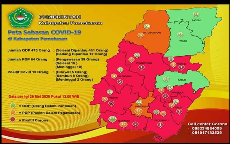 JATIMPOS.CO/PAMEKASAN - Peta Sebaran Covid-19 Kabupaten Pamekasan jam 13.00 tertanggal 29 Mei 2020, menyebutkan jumlah ODP 473 orang (selesai dipantau 461 orang, sedang dipantau 12 orang), PDP 64 orang (pengawasan 39 orang, selesai 15 orang, meninggal 10 orang), Positif Corona ada 15 orang (dirawat 5 orang, sembuh 8 orang, meninggal 2 orang).