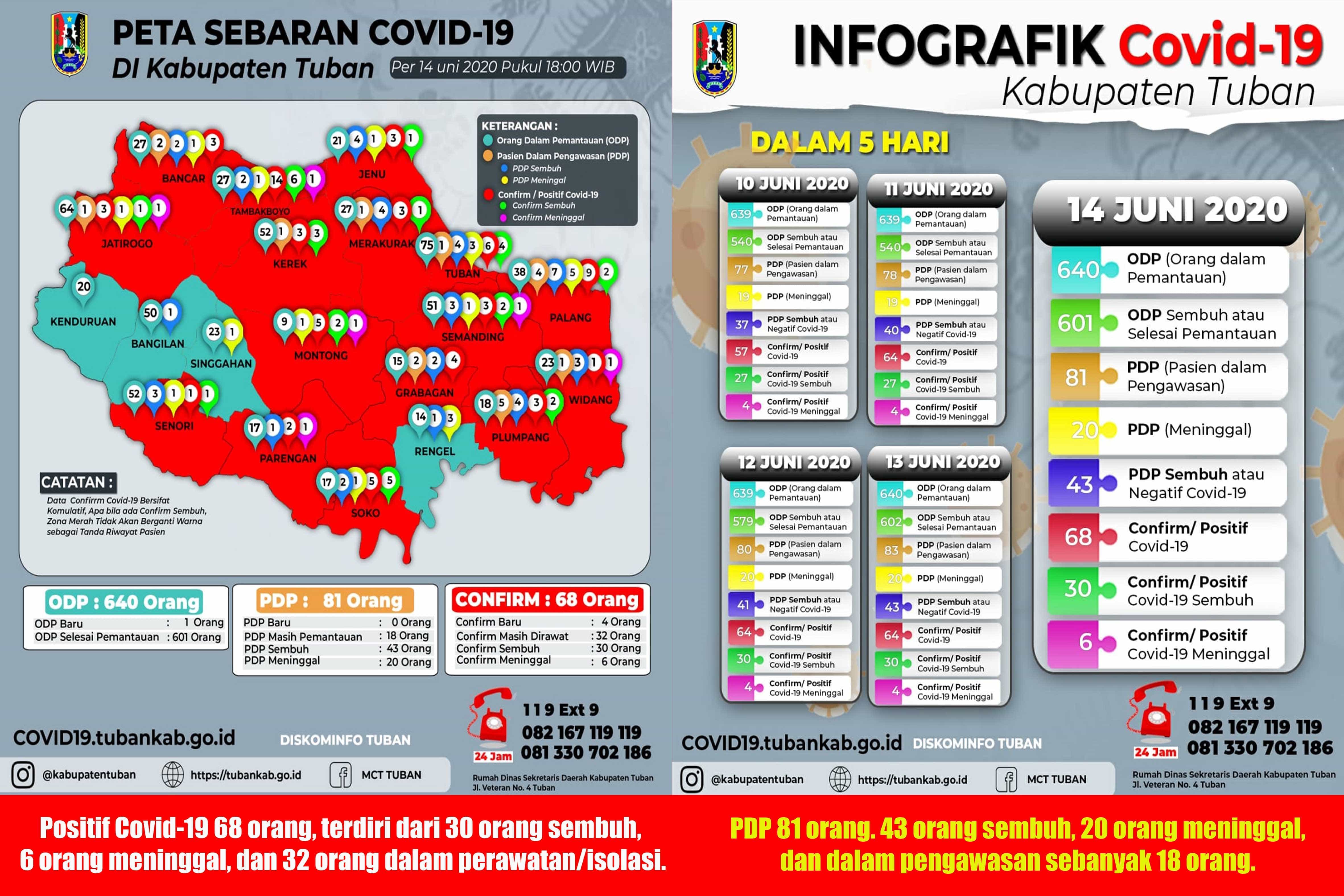 Juru bicara Gugus Tugas Percepatan Penanganan Covid-19 Kabupaten Tuban, Endah Nurul Komariyati mengatakan berdasarkan dari sumber Gugus Tugas, Minggu 14 Juni 2020 terkonfirmasi positif Covid-19 sebanyak 68 orang, terdiri dari 30 orang sembuh, 6 orang meninggal, dan 32 orang dalam perawatan/isolasi.