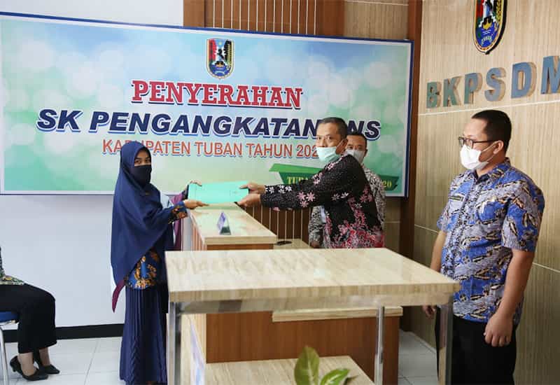 Kepala BKPSDM Kabupaten Tuban Nur Hasan mengatakan penyerahan SK Pengangkatan PNS menerapkan protokol Covid-19 secara ketat. Karena dilakukan selama 3 hari penerima SK PNS dibagi 15 gelombang. Setiap harinya terdapat 5 sesi, dengan rincian per sesi 20 penerima.