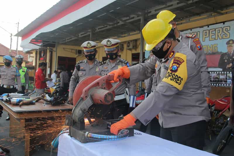 Tanpa ragu, sebanyak 62 knalpot brong tersebut dimusnahkan di halaman Mapolres Sampang oleh Kapolres Sampang, AKBP Didit Bambang Wibowo Saputra dan didampingi Kasat Lantas Polres Sampang, AKP Ayip Nur Rizal, Rabu (5/8/2020).
