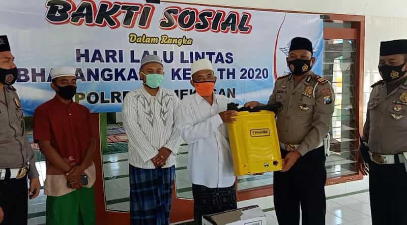 JATIMPOS.CO//PAMEKASAN - Satuan Lalulintas (Satlantas) Polres Pamekasan menyerahkan bantuan kepada Ketua DKM Masjid Al-Munawaroh, Jalan Raya Nyalaran, Pamekasan, Jawa Timur.