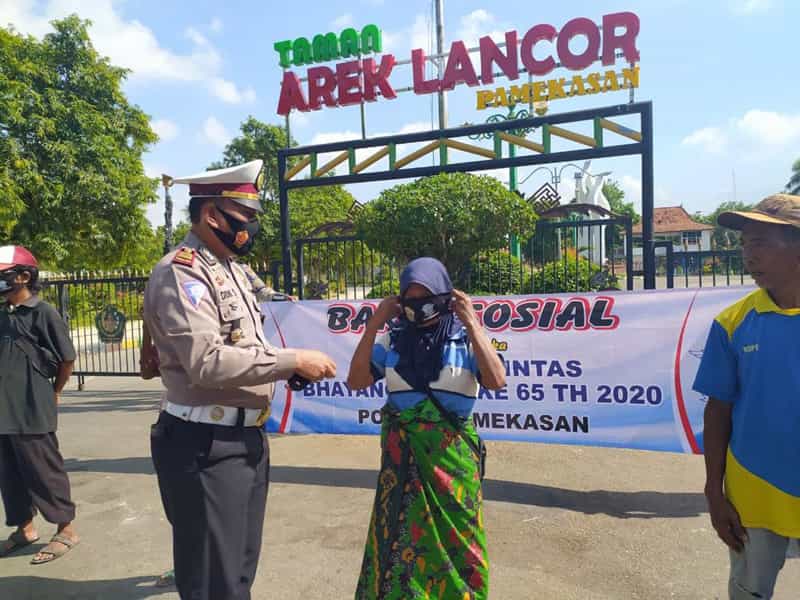 JATIMPOS.CO/PAMEKASAN - Satuan Lalulintas (Satlantas) Polres Pamekasan menggelar acara pembagian masker dan sembako dalam rangka HUT lalu lintas (Lalin) Bhayangkara ke - 65 di beberapa titik Kabupaten Pamekasan, Jawa Timur.