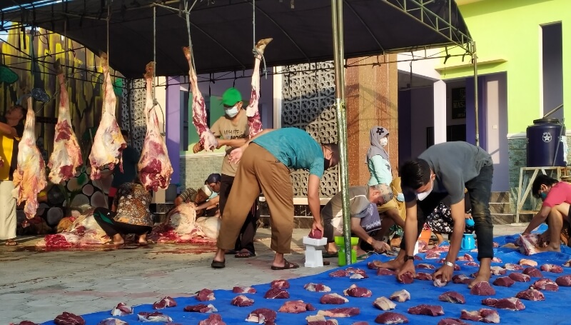 Penyembelihan hewan korban dilaksanakan sehari setelah sholat idul adha tepatnya Rabu (21/07/2021) pagi yang berlangsung di halaman Masjid Muttaqin dengan tetap menerapkan prokes covid-19.