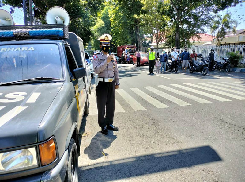 Pemberhentian tersebut dilakukan di setiap persimpangan jalan kota dengan membunyikan sirine, dan dibantu oleh anggota Satuan Lalulintas Polres Bondowoso.