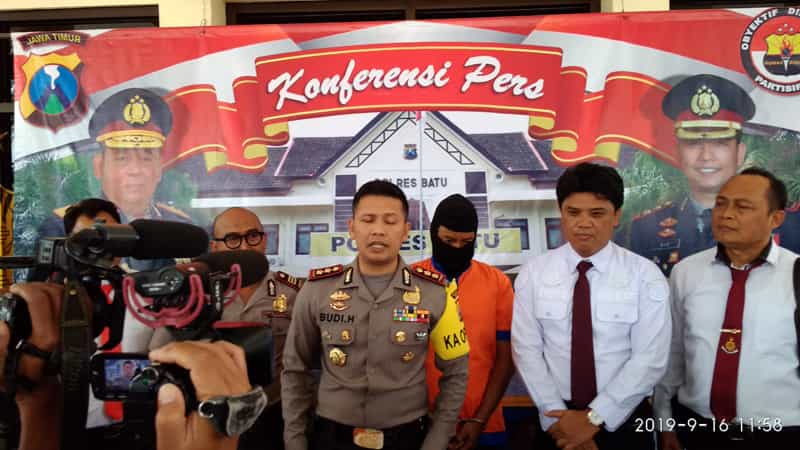 Kapolres Batu AKBP Budi Hermanto, S.Ik, M.Si didampingi Kasatreskrim AKP Hendro, serta Kapolsek Batu AKP H. Moh Luthfi, SH, MH dan personil Reskrim Polsek Batu, mengelar press release di hadapan sejumlah awak media, Senin (16/9/2019).