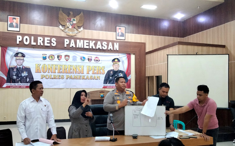 JATIMPOS.CO/PAMEKASAN - Kapolres Pamekasan, AKBP Jazuli Dani Iriawan menggelar konferensi pers perihal dugaan kasus tindak pidana pemalsuan surat dokumen tanah yang menimpa nenek Bahriyah (61) warga Kelurahan Gladak Anyar, Kabupaten Pamekasan, Madura.