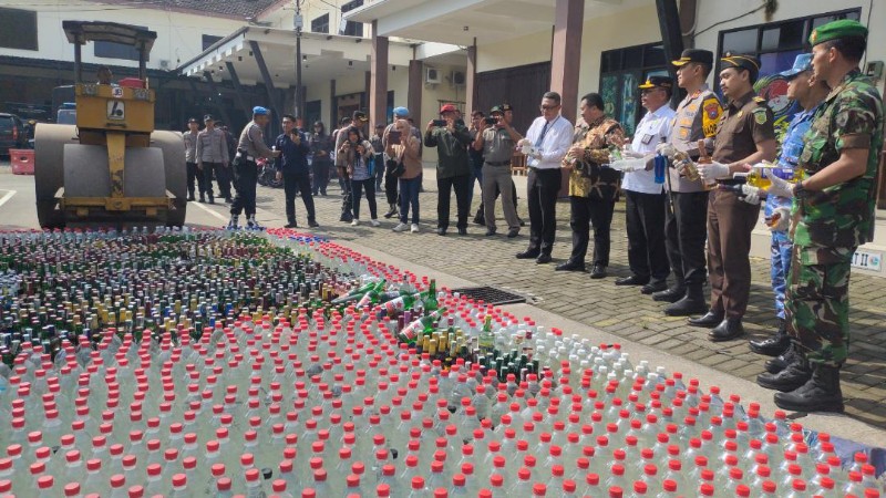 JATIMPOS.CO/JOMBANG - Polres Jombang memusnahkan 4.500 botol minuman keras (miras) hasil Operasi Pekat Semeru 2024. Ribuan botol miras berbagai jenis itu disita dari 25 penjual miras dari sejumlah wilayah di Jombang.