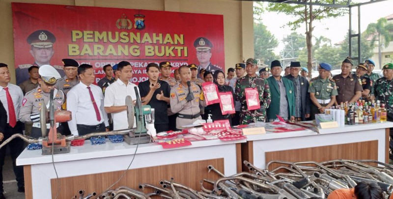 JATIMPOS.CO/ KABUPATEN MOJOKERTO - Polres Mojokerto melaksanakan pemusnahan barang bukti berupa narkoba, minuman keras, dan knalpot brong hasil operasi pekat semeru dan Kegiatan Rutin Yang Ditingkatkan (KRYD) menjelang hari raya Idul Fitri 1445 H di halaman Kantor Polres Mojokerto, Rabu (3/4/2024).