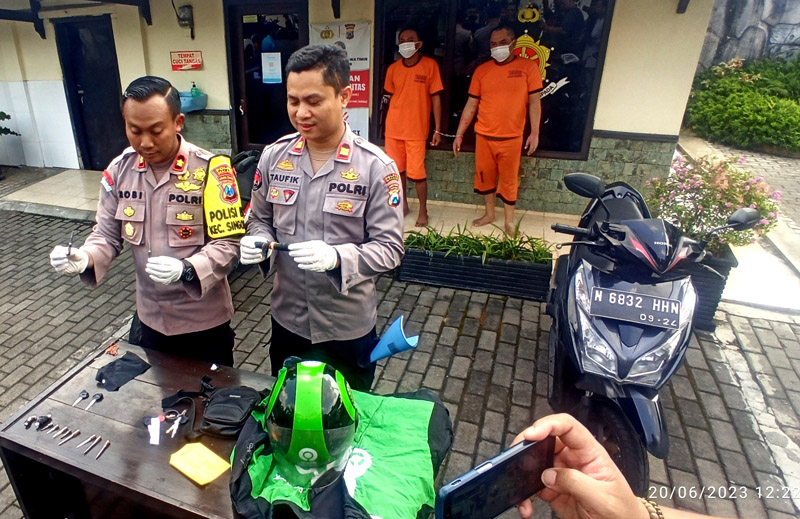 JATIMPOS.CO/MALANG - Polsek Singosari Polres Malang, merilis 2 tersangka pelaku curanmor beserta barang bukti yang digunakan, di halaman Polsek Singosari, Selasa (20/6/2023).