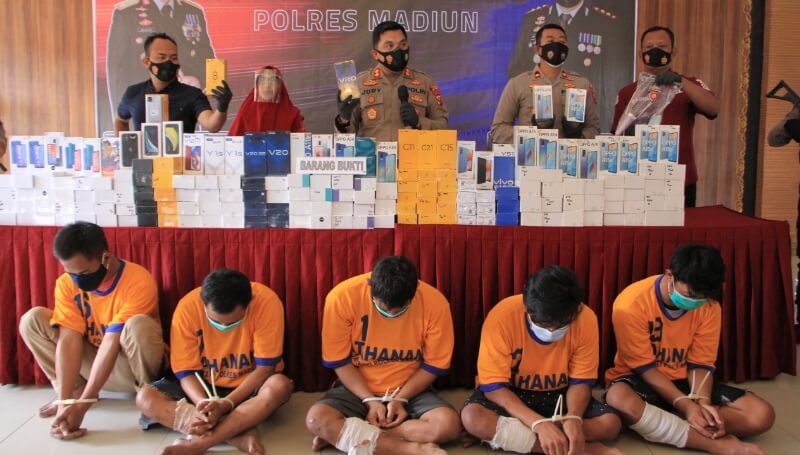 JATIMPOS.CO/KABUPATEN MADIUN - Sat Reskrim Polres Madiun berhasil menangkap lima tersangka pencurian Hand Phone di Toko Maju Hardware, di Jl. Anggrek, Kelurahan Bangunsari, Kecamatan Mejayan, Kabupaten Madiun yang dilakukan pada Selasa (22/6/2021) malam.