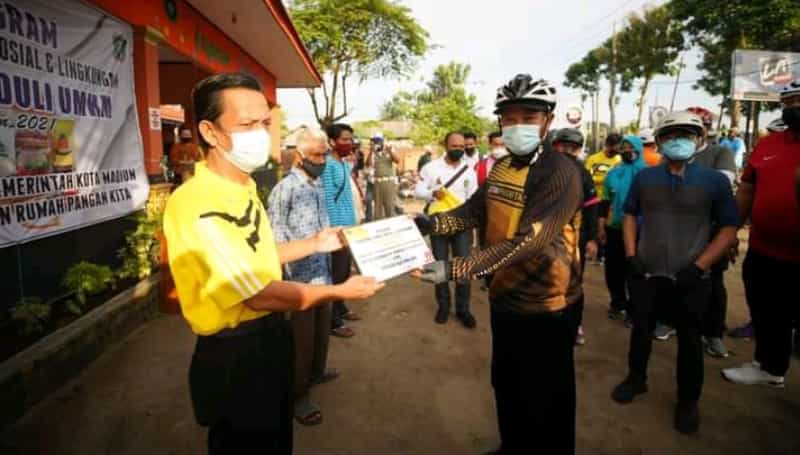 Wali Kota Madiun, H. Maidi didampingi Sesmenko Bidang Perekonomian RI Susiwijono Moegiarso menyerahkan CSR dari Perum Bulog ke lapak UMKM kelurahan.