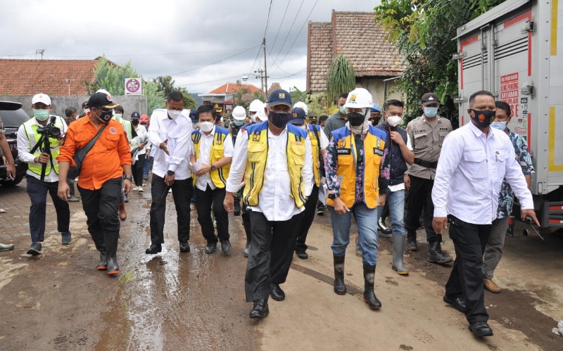 JATIMPOS.CO/KOTA BATU - Menteri Pekerjaan Umum dan Perumahan Rakyat (PUPR) Basuki Hadimuljono, melihat langsung penanganan banjir di Dusun Sambong, Desa Bulukerto, Kecamatan Bumiaji, Kota Batu, Kamis (11/11/2021).
