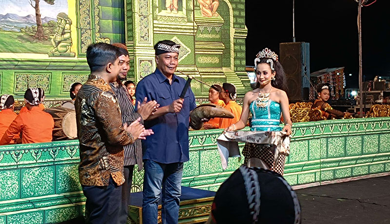 Kabid Kebudayaan Disbudpar Jatim, Dwi Supranto, SS, MM membunyikan kentongan tanda dimulainya pergeralan Kethoprak.
