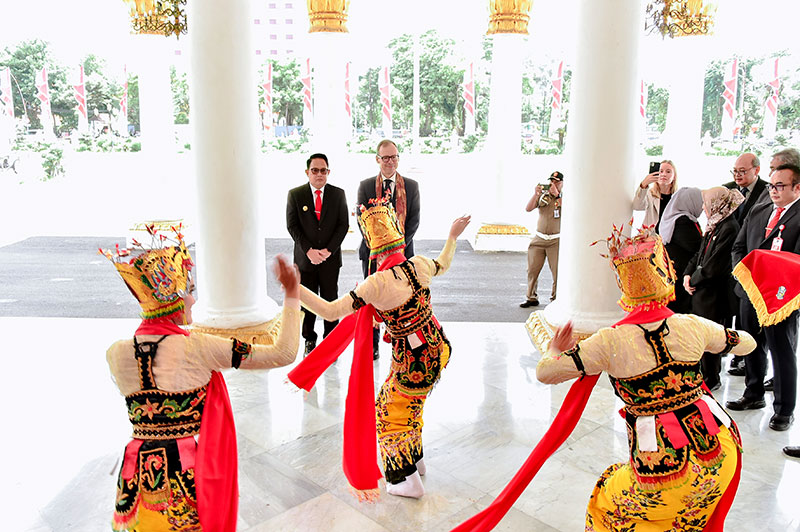 Pj Gubernur Adhy dan Dubes Swiss disambut Tari Jejer Gandrung di pintu masuk Gedung Grahadi Surabaya, Kamis (22/2/2023). foto : Mas Bram-Biro Adpim Pemprov Jatim