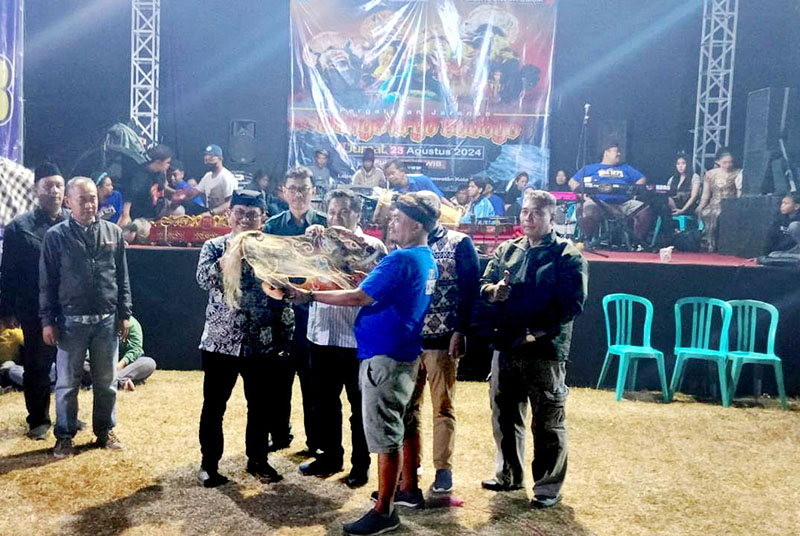 Ka UPT Taman Budaya Jatim Ali Ma’rup S.Sos., MM (tengah) bersama pimpinan Kelurahan Gedog dan Kecamatan Sananwetan, pemain jaranan dan perwakilan DPRD Jatim di Lapangan Kelurahan Gedog pada Jum’at malam (23/8/2024).