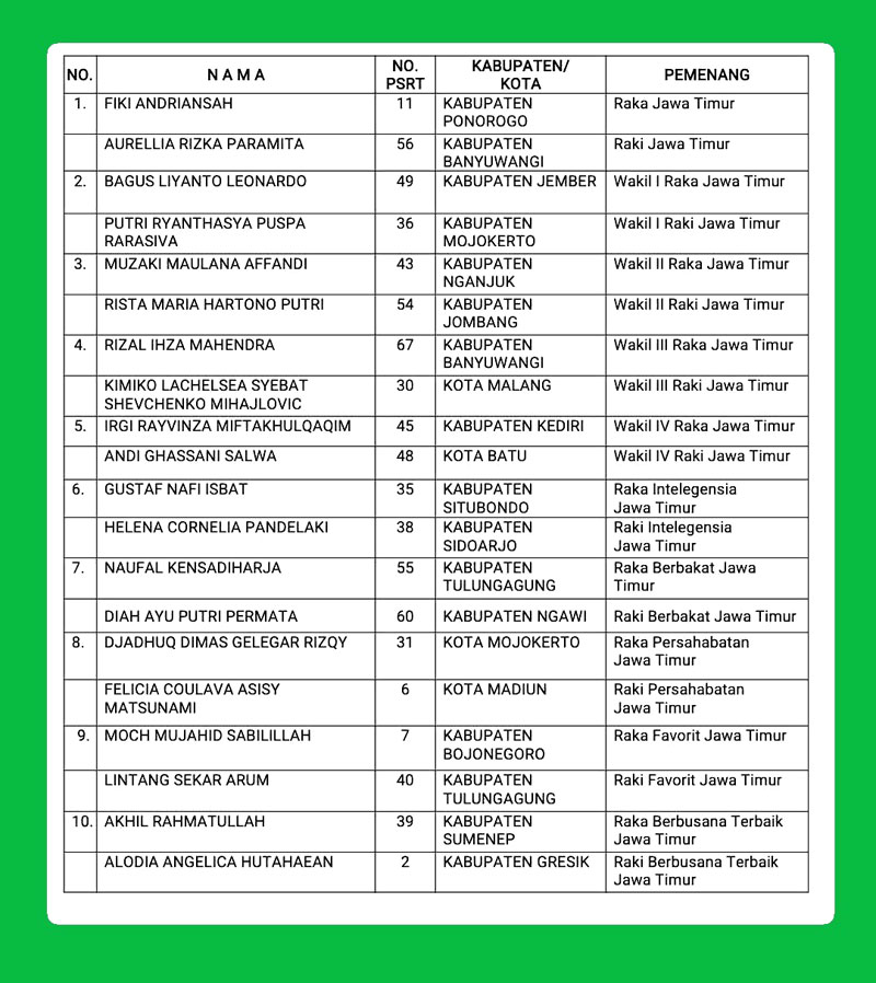 Lima Besar Raka-Raki Jatim 2024. Raka : Kab Ponorogo (Fiki), Kabupaten Kediri (Ray) Kab. Jember (Leo) Kab. Nganjuk (Muzza) Kab. Banyuwangi (Rizal) Raki: Kab. Mojokerto (Sasho), Kota Batu (Salwa), Kota Malang (Kimiko) Kab. Banyuwangi (Aurellia), Kab. Jombang (Rista)