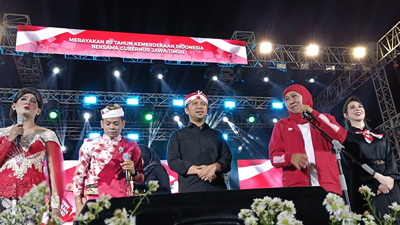 Wakil Gubernur Emil Elestianto Dardak juga turut menyapa warga. “Selamat menikmati hiburan ini, mari kita jaga persatuan. Selamat HUT ke-80 Republik Indonesia,” ujarnya singkat.