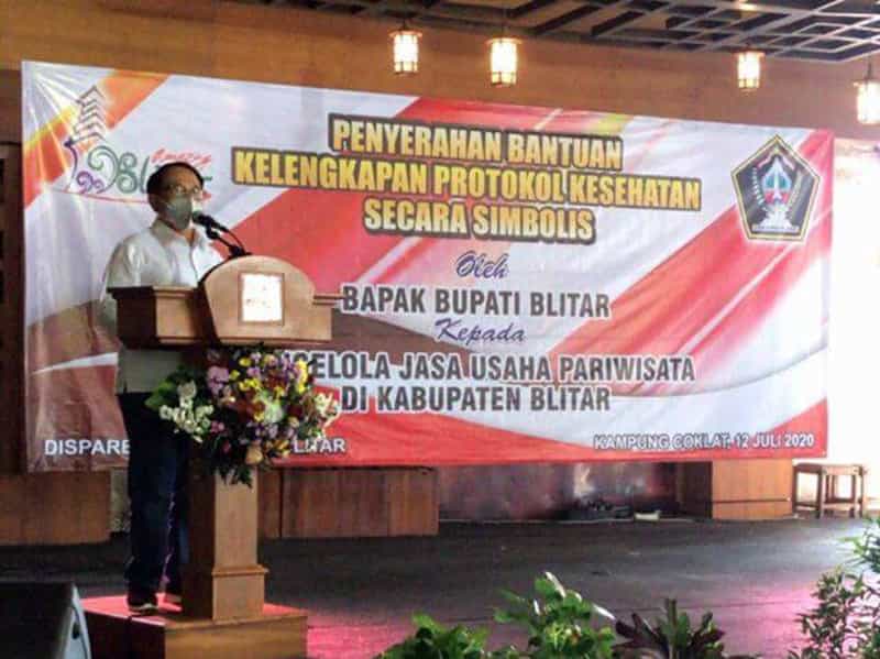 Hal ini disampaikan Bupati Blitar, H Rijanto saat menyerahkan bantuan perlengkapan protokol kesehatn kepada para pengelola jasa usaha pariwisata di Wisata Kampung Coklat, Minggu (12/7/2020).
