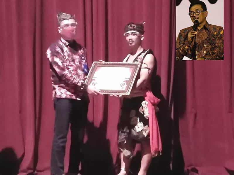 Ka UPT Taman Budaya, Agus Ramajanto, S.Sos, MM (kiri) memberikan sertifikat kepada peserta. Inzert : Kadisbudpar Jatim Sinarto, S.Kar, MM