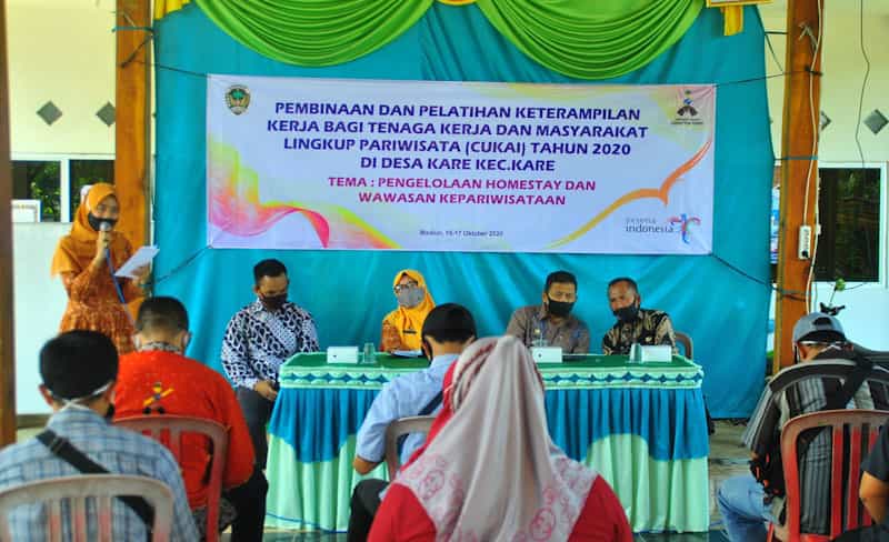 JATIMPOS.CO/KABUPATEN MADIUN - Dinas Pariwisata, Pemuda dan Olahraga (Disparpora) Kabupaten Madiun menggelar pembinaan dan pelatihan keterampilan kerja bagi tenaga kerja dan masyarakat lingkup pariwisata di Desa Kare, Kecamatan Kare, Kabupaten Madiun, Jum'at (16/10/2020).