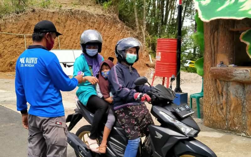 Pokdarwis Wisata Alam Watu Rumpuk melakukan pengecekan suhu tubuh di pintu masuk lokasi wisata.