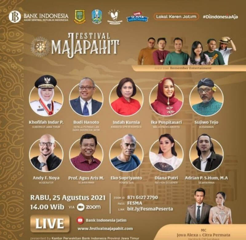 Agenda lainnya, yakni webinar Festival Majapahit dengan tema 'Meneladani Kejayaan Majapahit Dalam Memajukan Ekonomi Jawa Timur' dengan moderator Andy F. Noya dan menghadirkan empat narasumber antara lain, Prof Dr Agus Aris Munandar, dosen Arkeologi UI d,Adrian Perkasa, dosen Departemen Ilmu Sejarah Universitas Airlangga dan PhD candidate di Universiteit Leiden Diana Putri, perancang busana Eko Supriyanto, serta koreografer dan dosen ISI Surakarta. Masyarakat bisa mengikuti acara yang juga digelar secara virtual melalui Zoom Meeting dan live streaming YouTube Bank Indonesia Jatim. (Adv/din)