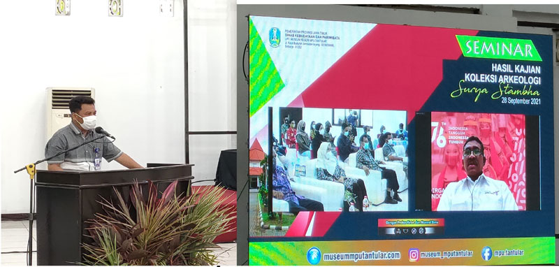 JATIMPOS.CO//SURABAYA- Puluhan ribu koleksi museum Negeri Mpu Tantular Sidoarjo Jatim tidak hanya menarik untuk dilihat, tetapi juga dikaji sejarahnya. Salahsatu dari puluhan ribu koleksi itu adalah “Surya Stambha”. Selasa (28/9/2021) dilakukan Seminar “Hasil Kajian Koleksi Arkeologi Surya Stambha” di Museum Mpu Tantular.
