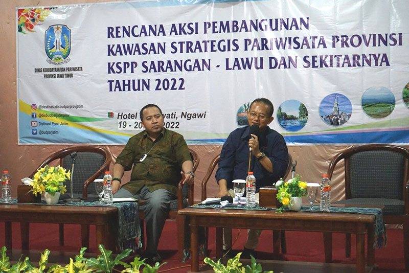 Kegiatan berlangsung di Sukowati Hotel, Ngawi Jawa Timur, tanggal 19-20 Mei 2022. “Kegiatan ini bertujuan untuk menyusun dokumen Rencana Aksi Pembangunan Kawasan Strategis Pariwisata Provinsi Sarangan-Lawu dan sekitarnya yang berkelanjutan,” ujar Dra. Susiati, MM Ketua penyelenggara yang juga Kabid Destinasi Pariwisata Disbudpar Jatim.