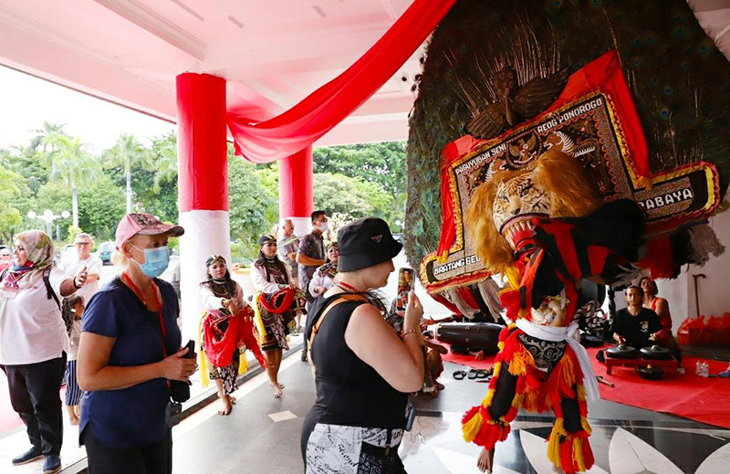 JATIMPOS.CO/SURABAYA - Sebanyak 570 wisatawan mancanegara terpesona dengan destinasi wisata di Kota Surabaya. Menggunakan Kapal Pesiar Viking Mars, rombongan tersebut berlabuh di Pelabuhan Tanjung Perak dan mengunjungi Balai Kota Surabaya, Jumat (9/12/2022). Setibanya di Halaman Balai Kota Surabaya, rombongan wisatawan disambut dengan penampilan atraksi Tarian Reog.