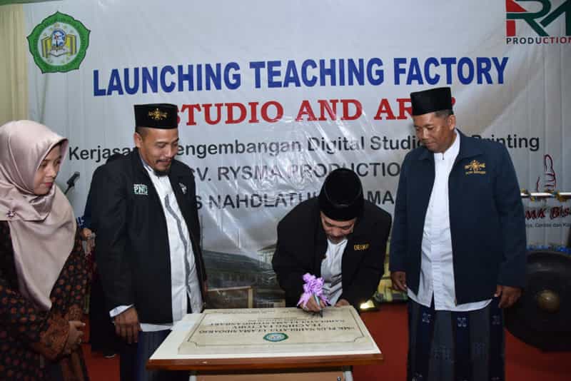 JATIMPOS.CO/SIDOARJO - Dalam rangka meningkatkan potensi siswa di era revolusi industry 4.0, SMK Plus NU Sidoarjo melaunching program Teaching Factory kerja sama dengan CV Risma Production meluncurkan Studio Art pada kompetensi Keahlian Desain Komunikasi Visual, Studio Art ini di resmikan oleh Plt. Bupati Sidoarjo H. Nur Ahmad Syaifuddin di damping Ketua PCNU Sidoarjo, Kepala Sekolah, dengan ditandai pemukulan gong serta penandatangan prasasti, Bertempat di Aula SMK Plus NU Sidoarjo, Rabu Siang (15/01).