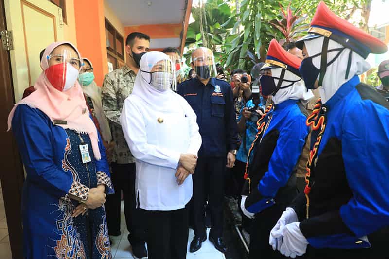 "Hari ini hari pertama uji coba pembelajaran tatap muka secara bertahap. Kita bisa lihat bahwa di sekolah ini semua protokol kesehatan terjaga. Anak-anak yang datang dicek dulu di check point, protokol kesehatan ditegakkan betul. Dan kapasitasnya ini hanya sembilan orang per kelas," kata Khofifah usai peninjauan.