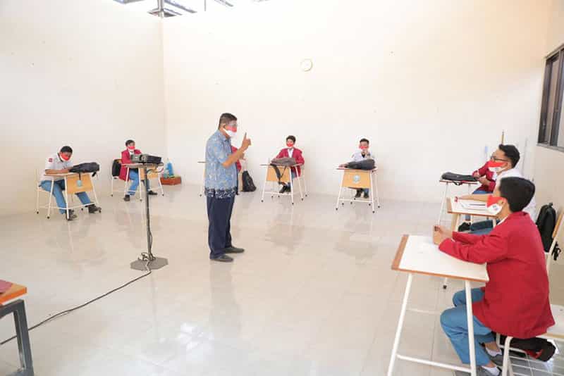 Selain itu setiap siswa juga wajib mengenakan masker dan juga face shield selama mengikuti kegiatan belajar di kelas. Dan jarak bangku antar siswa di dalam kelas juga dipastikan aman dengan jarak minimal satu meter.