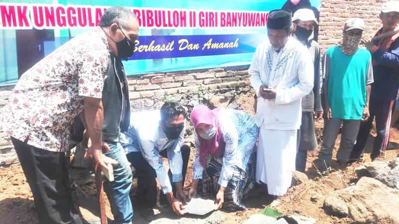 JATIMPOS.CO/BANYUWANGI - Peletakan batu pertama Yayasan Salam Sejahtera Internasional ( SSI ) SMK Unggulan Habibullah 2 Giri, Banyuwangi oleh Hj Fatimah, disaksikan oleh Lurah Giri yang diwakili Kaur Kesra A Majid, Kepala Sekolah beserta dewan guru dan LSM Gagak Hitam Jaya, pada Kamis, 17 September 2020.