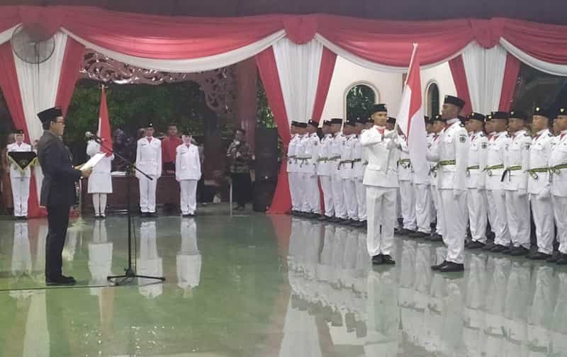 JATIMPOS.CO/PAMEKASAN - Bupati Pamekasan, Baddrut Tamam, mengukuhkan Pasukan Pengibar Bendera Pusaka (Paskibraka) tahun 2019 di Mandhepah Agung Ronggosukowati, Kamis (15/08).