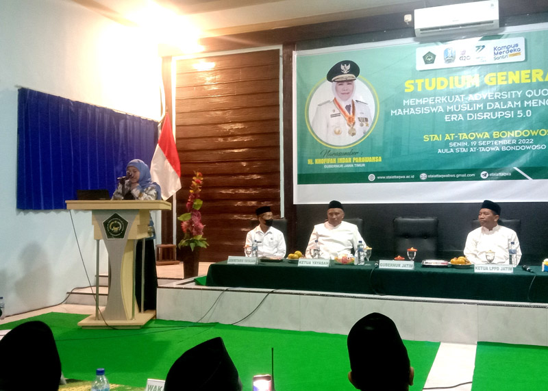 JATIMPOS.CO/BONDOWOSO - Guna memperkuat adversity quotient mahasiswa muslim dalam menghadapi era disrupsi 5.0, Sekolah Tinggi Agama Islam (STAI) At-Taqwa Bondowoso gelar Studium General bersama Gubernur Jawa Timur, Khofifah Indar Parawansa, di aula setempat, Senin (19/9/2022) malam.