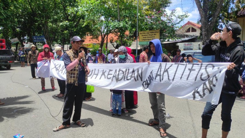 Dalam aksinya massa menuntut agar dua terduga pembunuhan petani bernama Patola segera disidangkan.