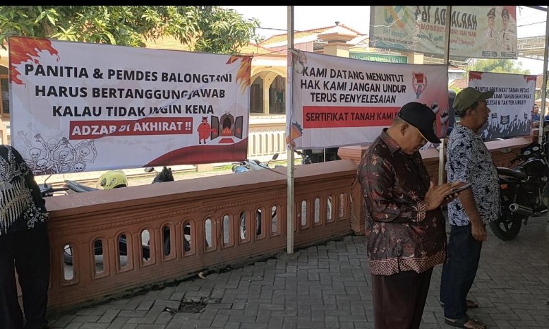 "Warga ini sudah lelah terhadap tipu muslihat Pemdes Balongtani. Pasalnya sudah 5 tahun sejak 2018 pengajuan sertifikat hak milik tanah tak kunjung selesai", ujar Imam Safi'i, koordinator aksi saat dikonfirmasi.