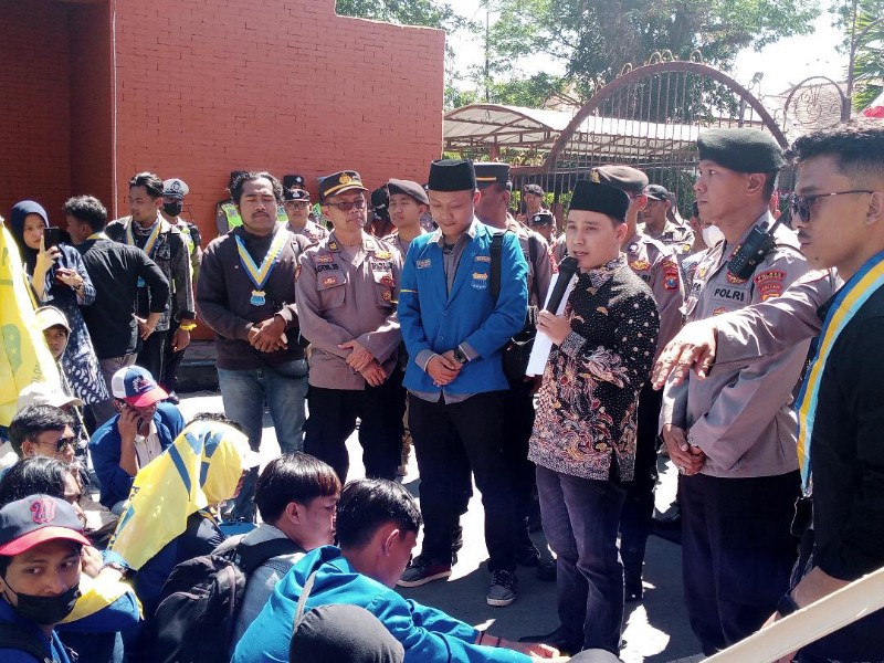 Puluhan mahasiswa yang tergabung PMII ini menggelar unjuk rasa di depan Kantor Bupati Mojokerto, menuntut kepastian tempat relokasi bagi PKL Modongan, Selasa (1/8/2023).