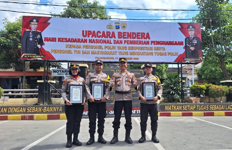 Penghargaan kepada Kapolsek Karangrejo diserahkan langsung oleh Kapolres Tulungagung dalam upacara tersebut.