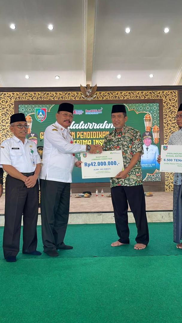 Pada momentum tersebut juga diserahkan santunan program jaminan kematian dari BPJS Ketenagakerjaan kepada 3 ahli waris guru TPQ masing-masing senilai Rp. 42.000.000 (Empat Puluh Dua Juta Rupiah).