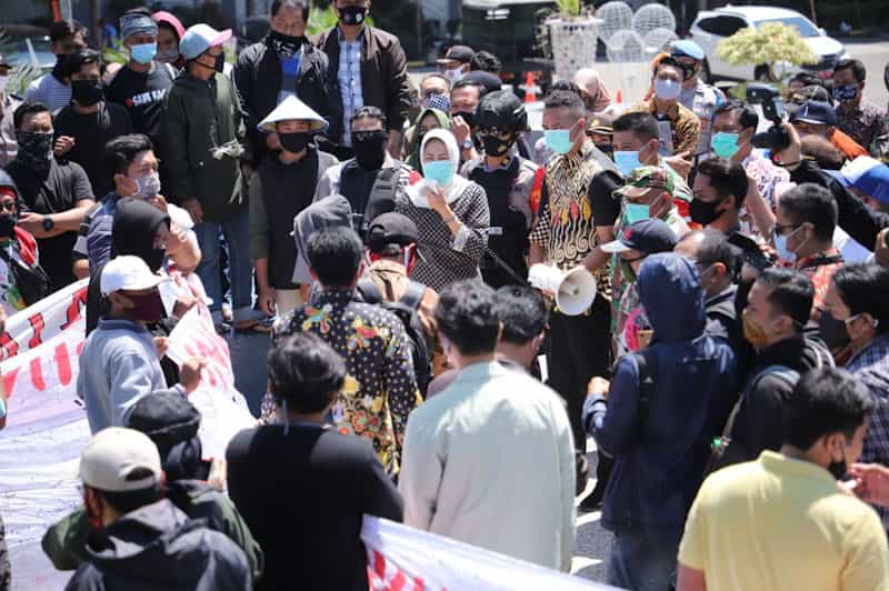 JATIMPOS/KOTA BATU - Warga Desa Pesanggrahan, Kecamatan Batu, Kota Batu, bersama Gebrak (Gerakan Bersama Rakyat Kasinan) lakukan aksi damai di depan Balai Kota Among Tani Pemkot Batu, Kamis (24/9/2020).
