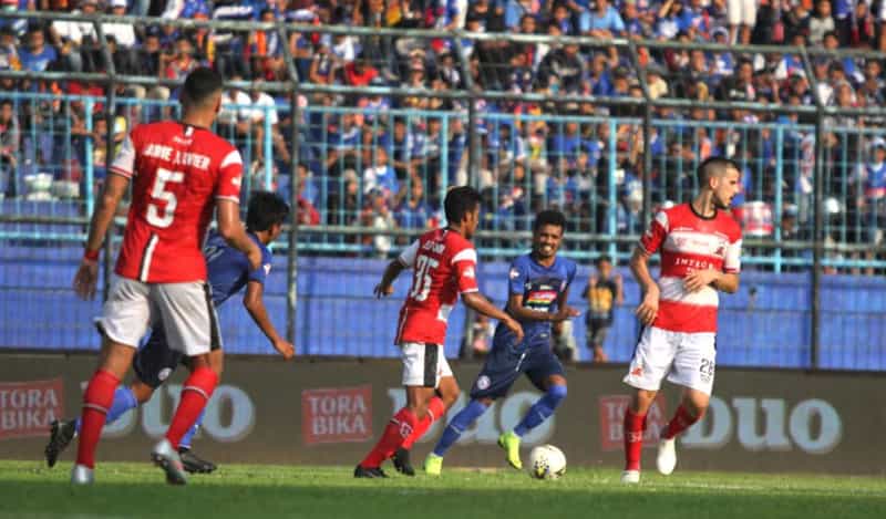 Arema FC kembali menyerang pertahanan Laskar Sape Kerab, julukan Madura United. Namun, tendangan keras yang diluncurkan Nur Hardianto pada menit ke-11 berhasil di antisipasi penjaga gawang Madura United.