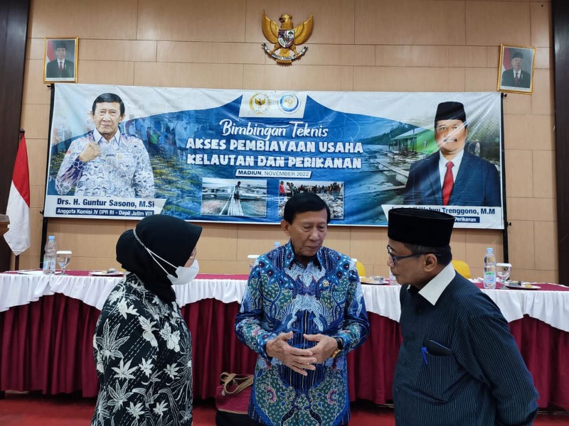JATIMPOS.CO/MADIUN - Anggota DPR RI Komisi IV Fraksi Partai Demokrat, Drs. H. Guntur Sasono, M.Si bersama Kementerian Kelautan dan Perikanan (KKP) menggelar Bimbingan Teknis (Bimtek) akses pembiayaan usaha kelautan dan perikanan di Rumah Makan Ayam Goreng Pemuda Kota Madiun, Sabtu (12/11/2022).