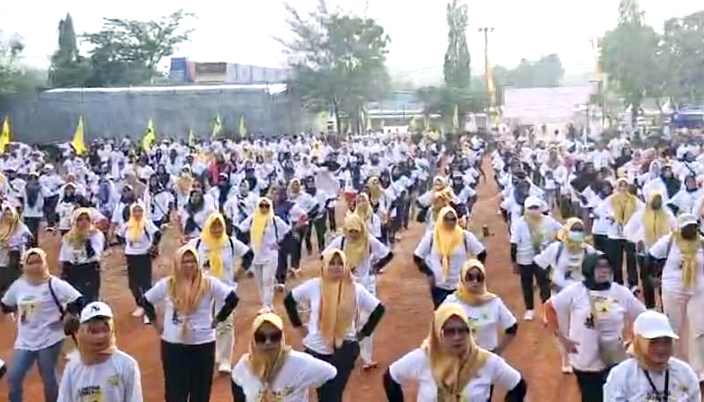 Ribuan peserta senam dari kalangan ibu-ibu hingga generasi milenial kompak dan semangat mengikuti gerakan senam yang dipandu instruktur senam.